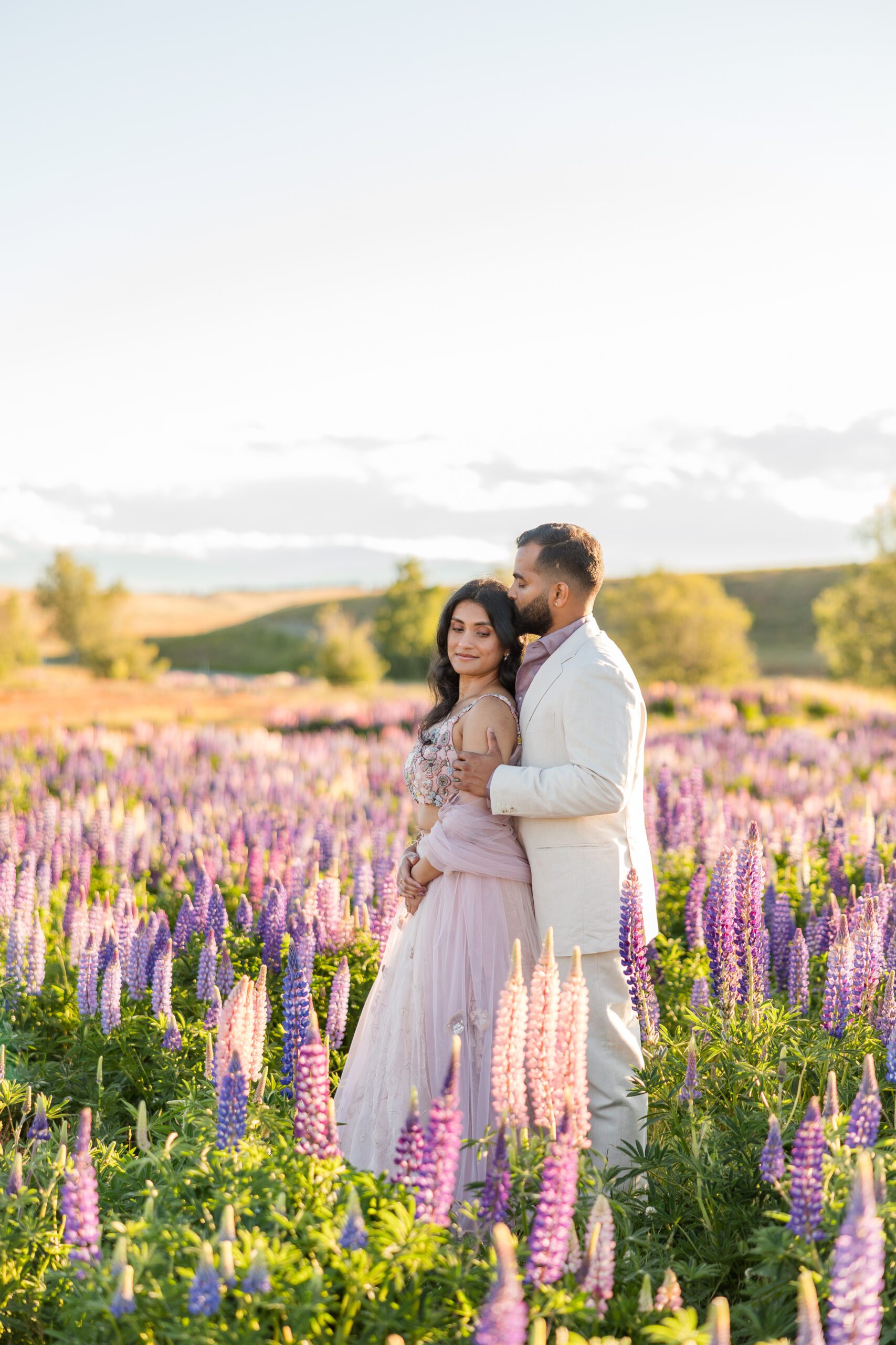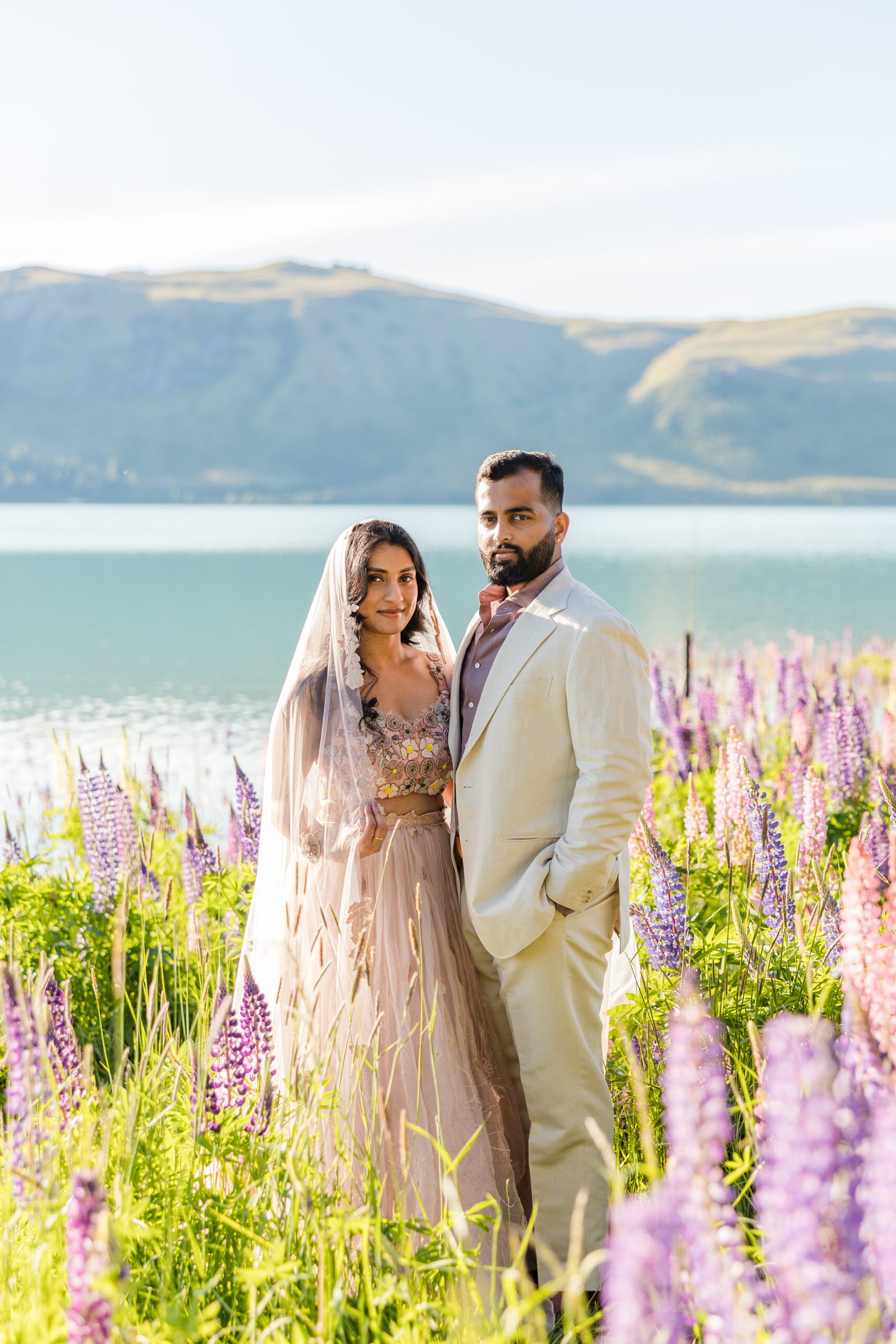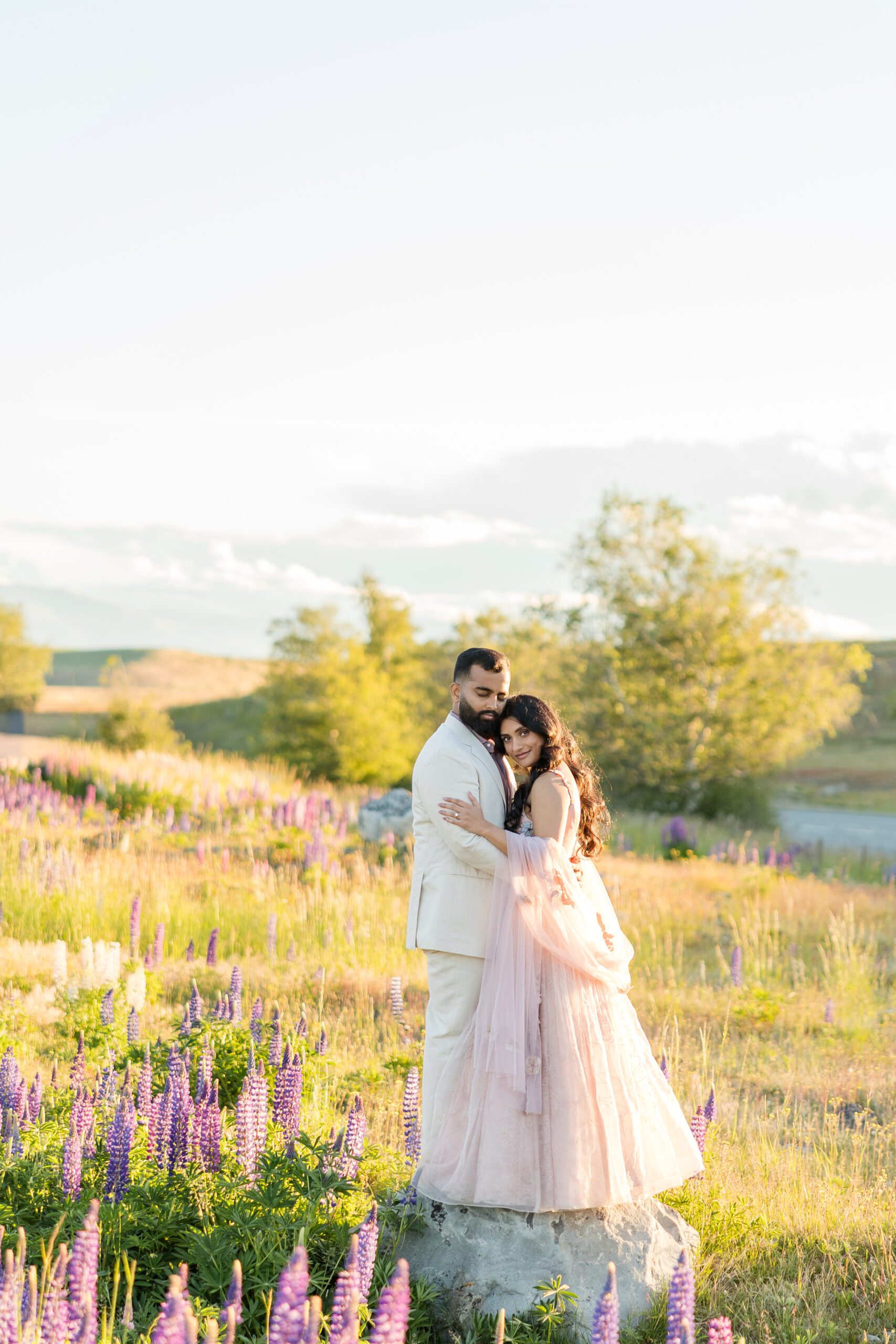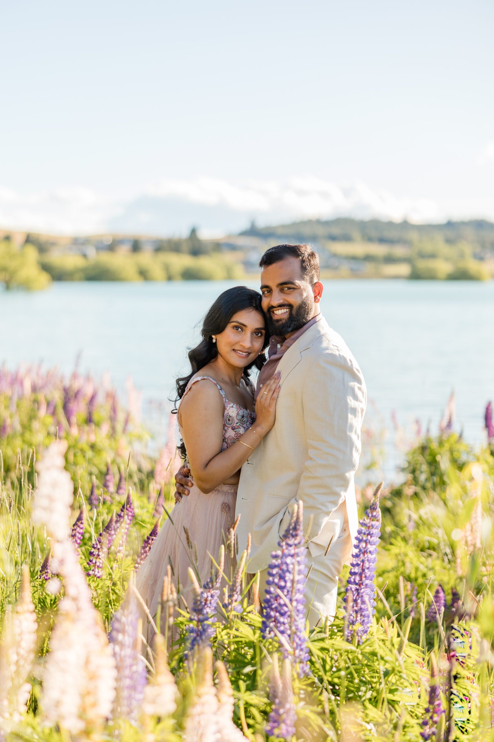 The famous lupine season typically peaks from mid-November through early January. The images in this post, from Akhila & Jas’ engagement session were taken on December 2nd! During these summer weeks, the roadsides, riverbeds, and lakeshores come alive with towering wildflowers. Planning your portrait session during this window ensures you’ll capture the iconic glow and color that Lake Tekapo is known for.