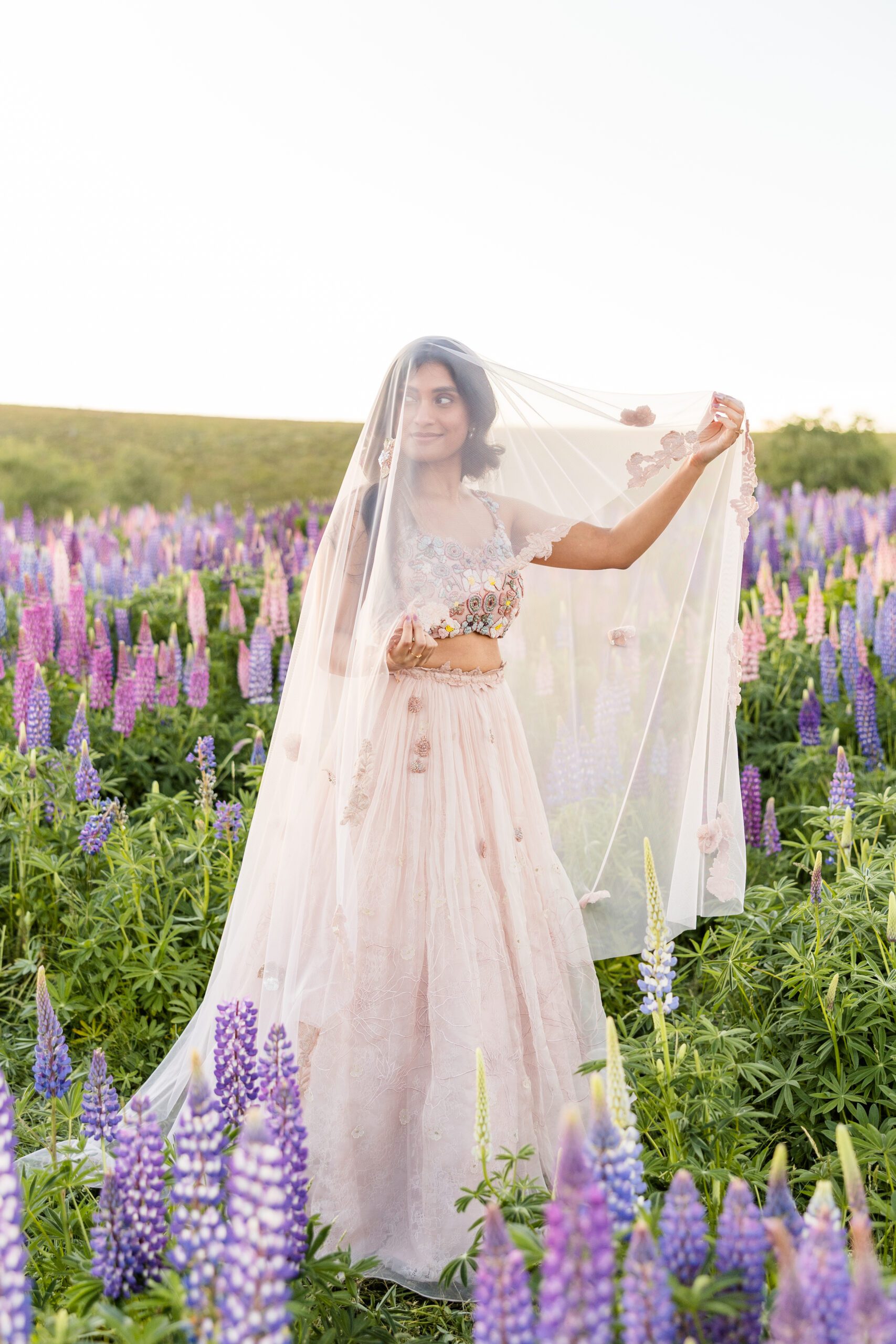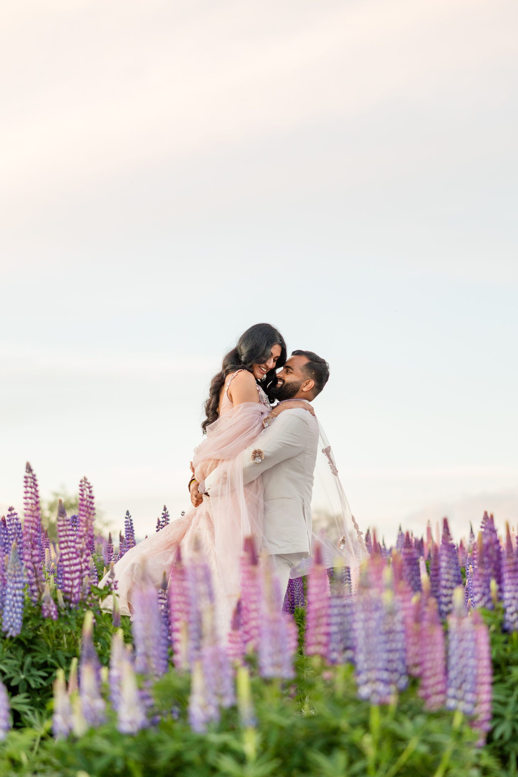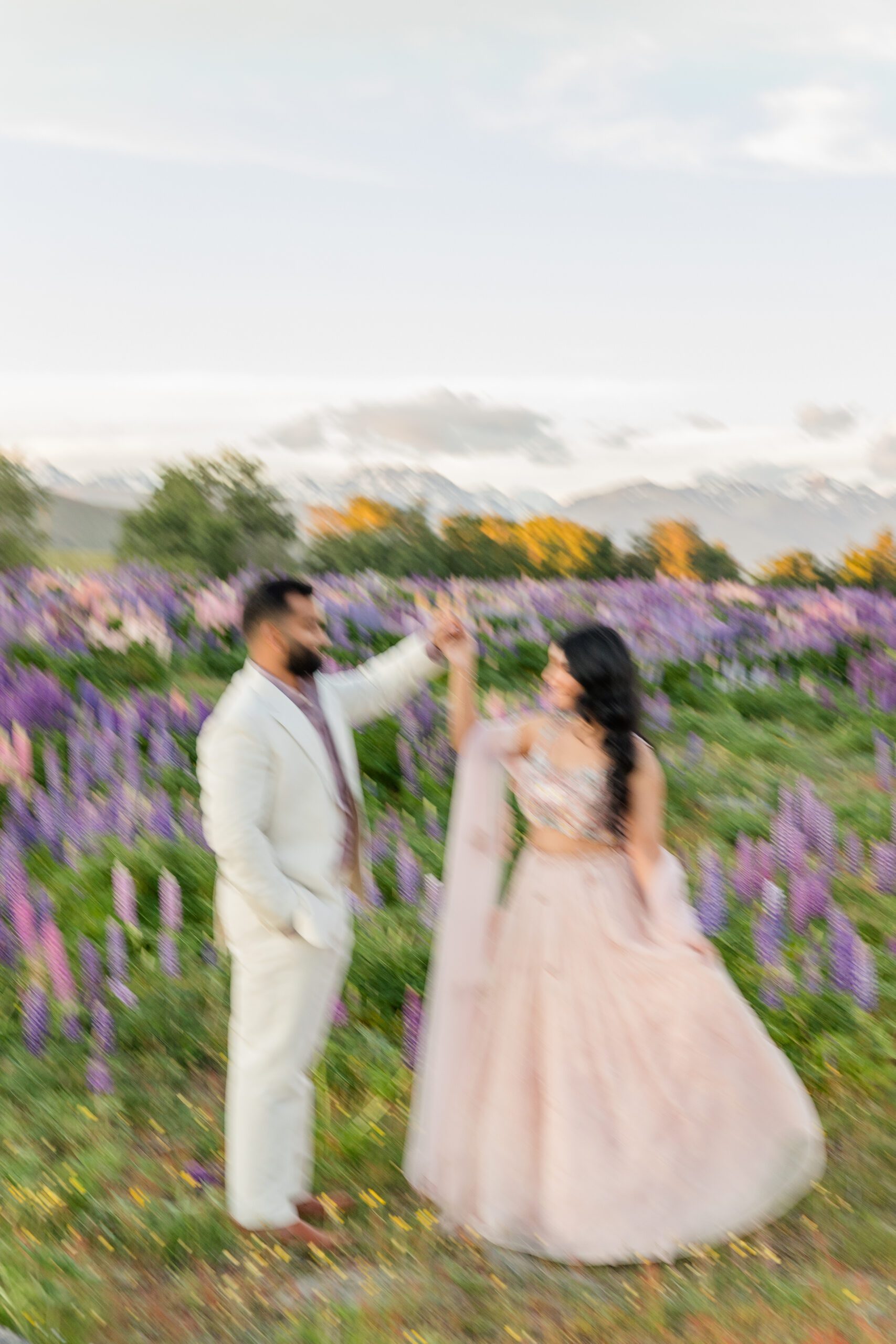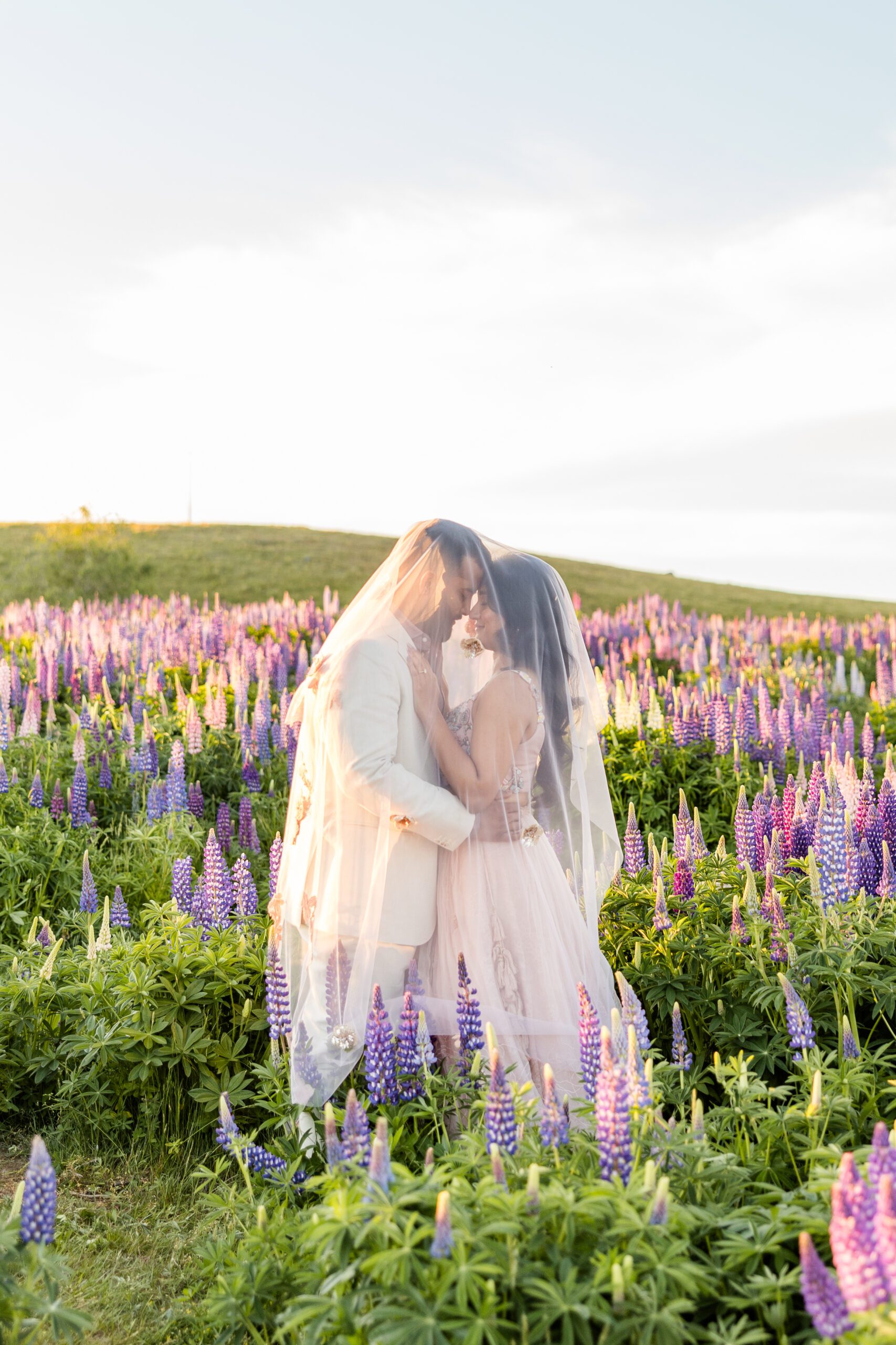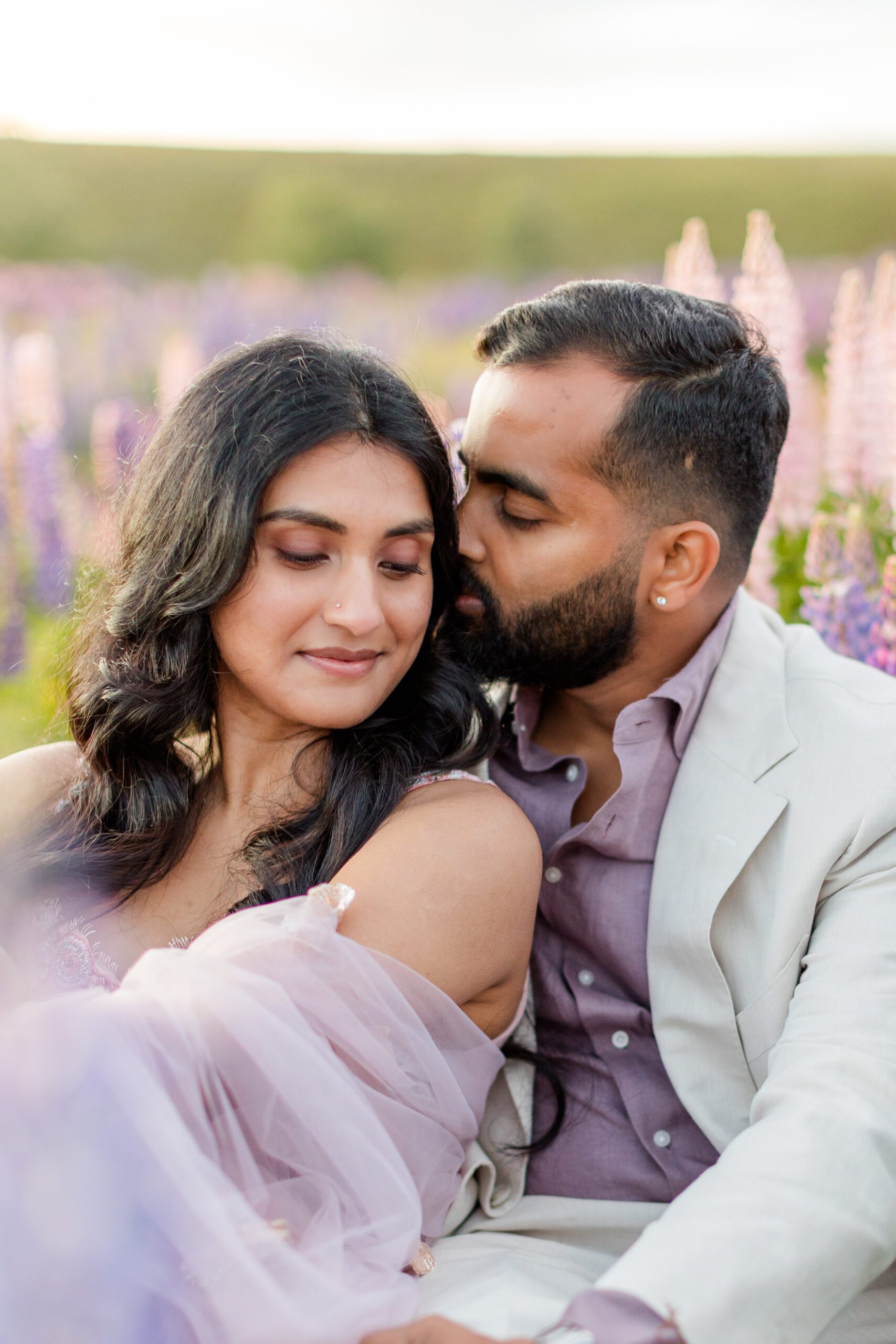 The famous lupine season typically peaks from mid-November through early January. The images in this post, from Akhila & Jas’ engagement session were taken on December 2nd! During these summer weeks, the roadsides, riverbeds, and lakeshores come alive with towering wildflowers. Planning your portrait session during this window ensures you’ll capture the iconic glow and color that Lake Tekapo is known for.